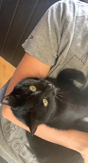 Hun er helt sort med unntak av en bitteliten hvit flekk på brystet og en hvit flekk nederst på magen. Hun er litt over ett år og ganske liten og slank i størrelse. Hun er pratsom og pleier å svare når vi plystrer på henne. Nysgjerrig frøken som elsker å klarte og utforske både høyt og lavt. Veldig glad i kos når hun er trygg på deg.