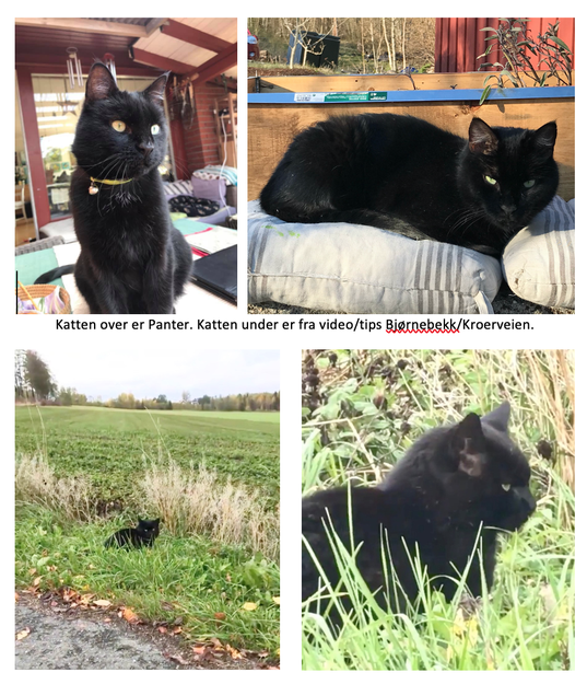 Panter (10år og diabetiker på insulin) forsvant 12.september. Vi har en mistanke om at han forvillet seg inn i en åpen varebil ute i gaten Bekkveien/Vinterbro. Vi fikk 15.oktober tips og video om at han er observert i Bjørnebakk/Kroerveien i Ås i begynnelsen av oktober - og vi er temmelig sikre på at det er Panter. Vi leter på stedet han er observert, men han kan også være på vei videre og søker nok hjem mot Askehaugskogen/Bekk/Nesset. Siste tips fikk vi i går kveld (som vi nå er på vei for å sjekke), hvor noen hadde sett en liknende katt på Kroerveien nærmere Vestby/ved Fallentinbekken. Er det noen som ser denne karen blir vi fryktelig glade for informasjon. Beste hilsen, Gøril, Bill og Nicolai