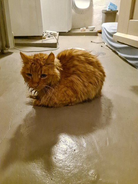Fant en katt utenfor i dag tidlig. Han var helt gjennomvåt og frossen og klarte ikke å bevege seg. Veldig redd. Tok han med inn og nå er han varm og har fått mat, men fortsatt veldig redd.