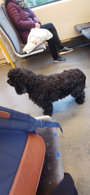 Hund funnet på t-banen, går alene. Litt tillitsfull, men redd for å gå av t-banen med oss. Har ikke bånd. Litt skadet hale.