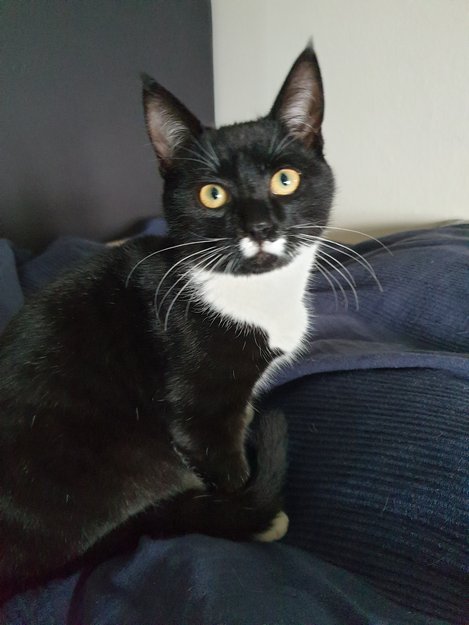 Katten dukket bare opp lørdag kveld kl 21.30. Den vil bare inn. Veldig kosete og kjælen. Halvvoksen. Ingen i nabolaget kjenner den.