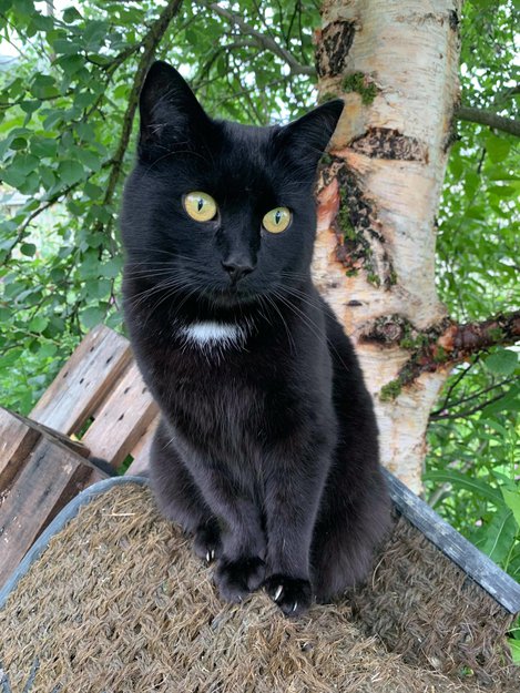 Sort katt, gule øyne, liten hvit flekk på brystet. Noen få gråhår i pelsen. Ikke stor til å være hankatt. Pusi er 5 år. Ekstremt glad i fisk.