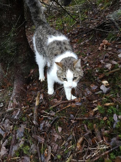 Holder seg utenfor til oss og mjauer mye.