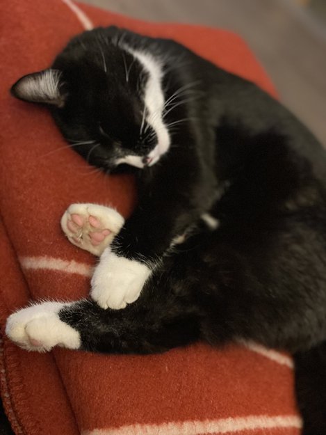 En ganske liten, ung hokatt. Svart, blank pels med hvite poter og litt asymmetrisk hvitt i ansiktet.