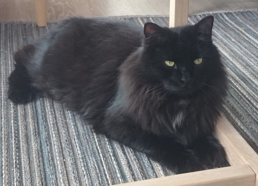 Svart lodden med kvit rose under haka og mage. Mangler nesten heile halen sin.