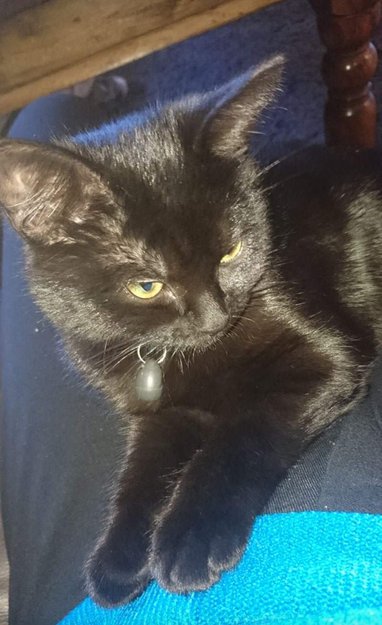 Hun har ikke halsbåndet på nå.4-5 hvite hårstrå under haka.Kortere bein og hale enn en vanlig huskatt.