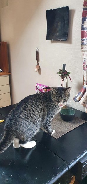 den har vært en del i hagen her siden sommeren, trodde det var en katt i nabolaget. Nå forstår jeg at det er en huskatt som har gått seg bort. den er ung, sulten og engstelig, jeg har lokket den inn på kjøkkenet og gitt den mat, den er ikke id-merket.