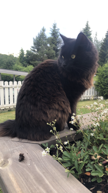 Gulgrønne øyner og brunsvart mellomlang pels.