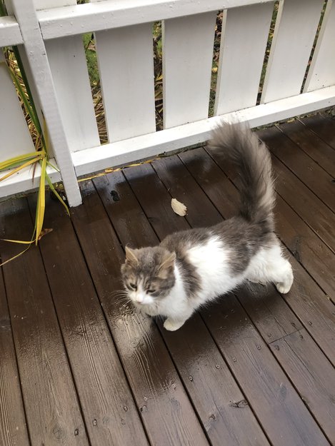 Ganske ung katt, henger rundt hus og rundt oss. Sover ute under et tak på terassen og er sosial og kosete. Hun har fått litt mat i cirka 1-2 dager.