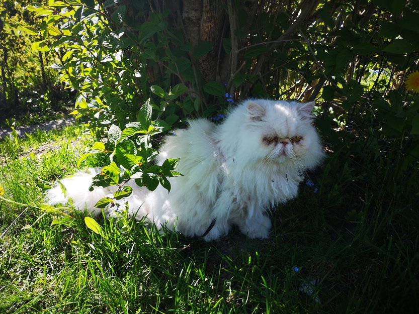 Han er kremhvit med svakt oransjeskjær på ryggen, lang pels. Inni øret ble tallet 10 (tror jeg) tatovert inn da han ble chippet.