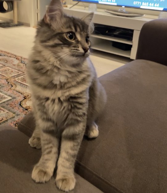Hallen hennes slenger seg forover. Hun er grå/vit. Neste gul/grønn øyner.