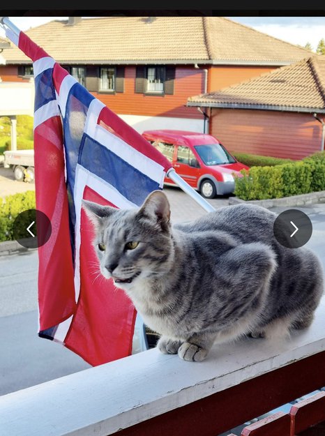 Vis du klirrer i skål så pleier han å komme bort til deg. Han er chippet men jeg har ikke nr på den. Eieren står registret i Sarpsborg.