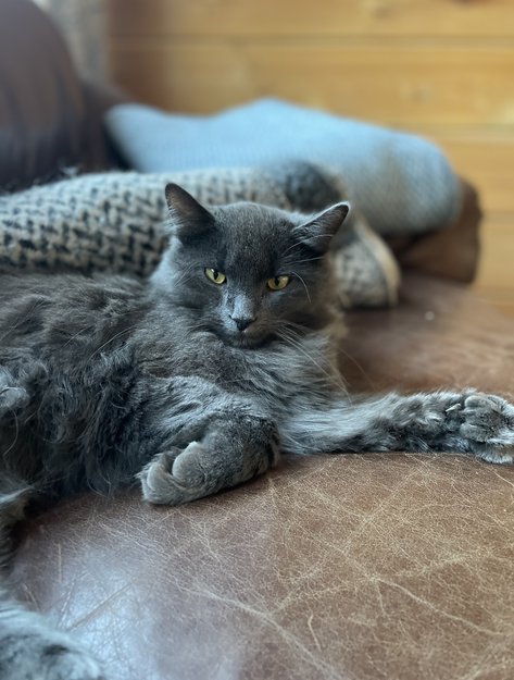 Katten har grå, myk pels, 1 år gammel, så fortsatt ikke veldig stor.