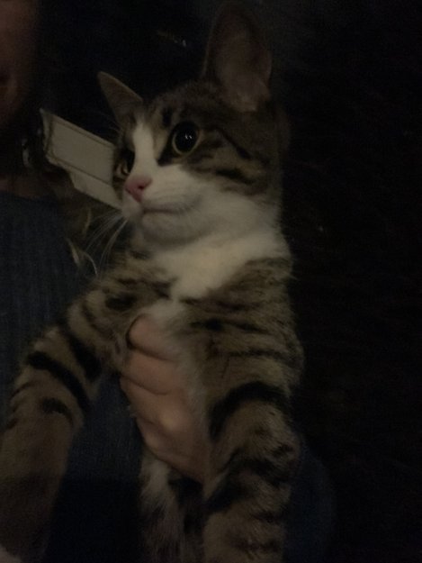 Spraglete/stripete pels, hvite poter samt på brystet. Velstelt og fin i pelsen. Ingen halsbånd. Svært ung katt( kattunge?).