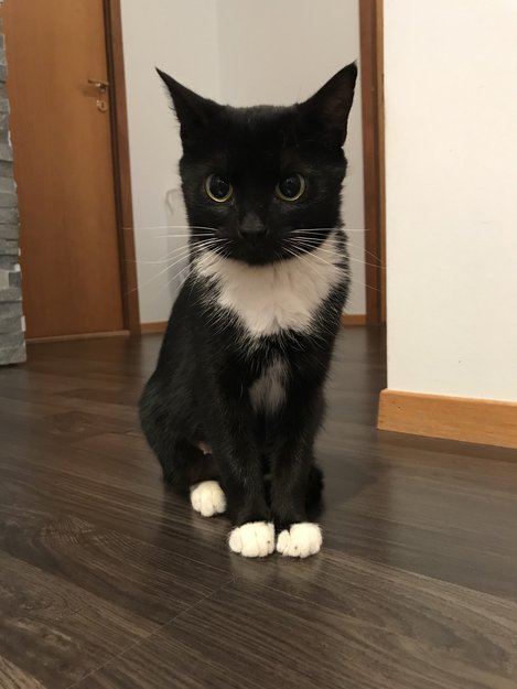 Hun er sterilisert og chippet .Ganske liten pus ,hadde hålsband på seg.