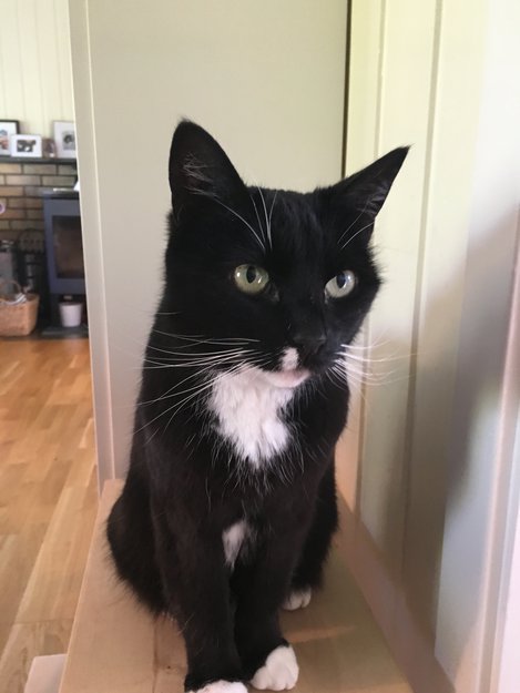 Svart katt med hvite føtter, hvitt på halsen og litt hvitt (en liten flekk) ved snuten på venstre side. Veldig blank og myk i pelsen. Er ID merket (tatovert) på innsiden av øret. Veldig glad i mat og begeistret for å sitte på vinduskarmen eller på myke overflater.