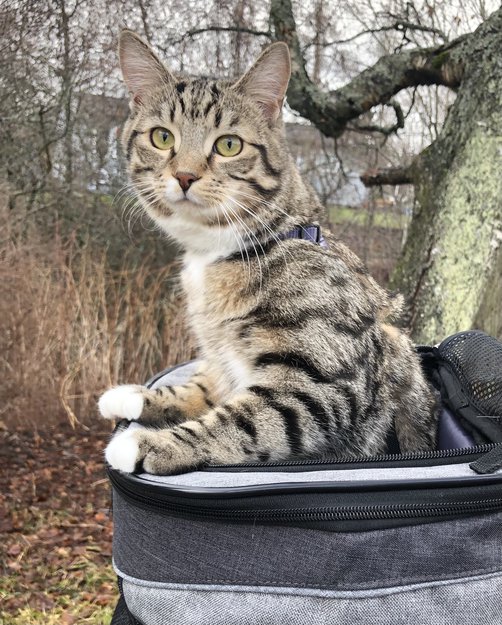 Han har en liten beige flekk ved nesa, og har forskjellige farger på potene.