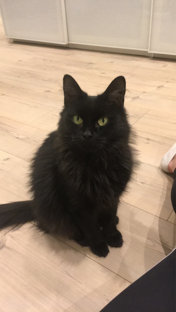 Langhåret svart pus. Hun er litt sjenert, for nye mennesker. Men etter hvert når hun blir varm i trøyen, er hun kjempe kosete. Liker ikke bråe lyder eller bevegelser så vær varsom. Hun liker ikke å bli holdt. Hun skal være merket.