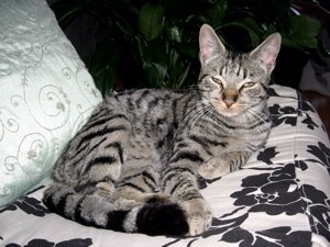 Grå/brun med svarte tigertegninger, lang hale og lange ben.