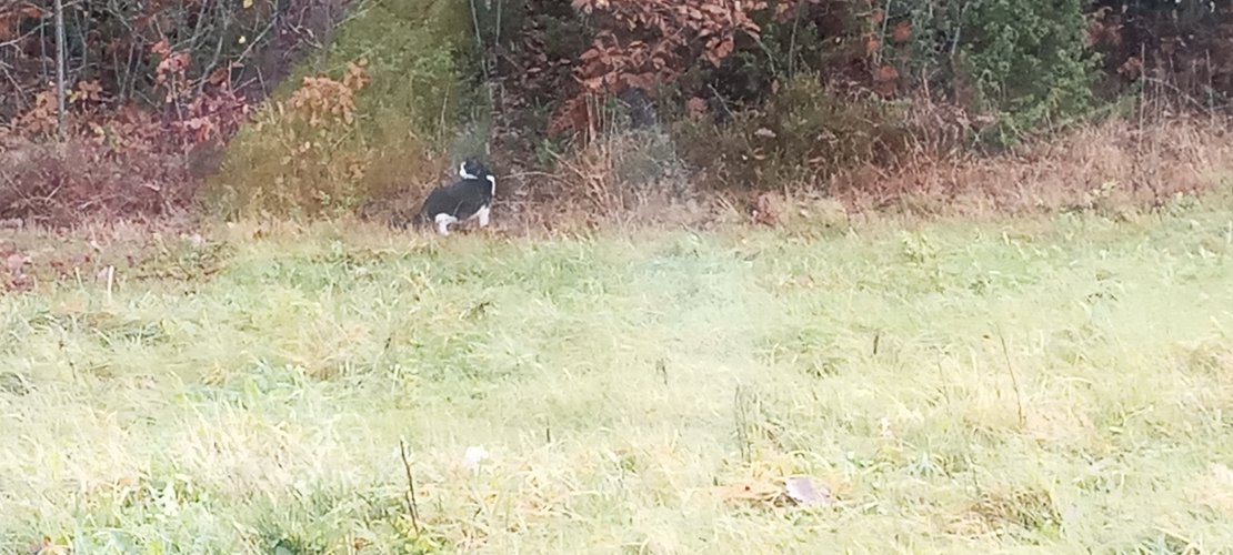 Jeg stoppet et sted før Arendal, langs E-18, og der så jeg en sort og hvit katt som gikk i skogkanten.
