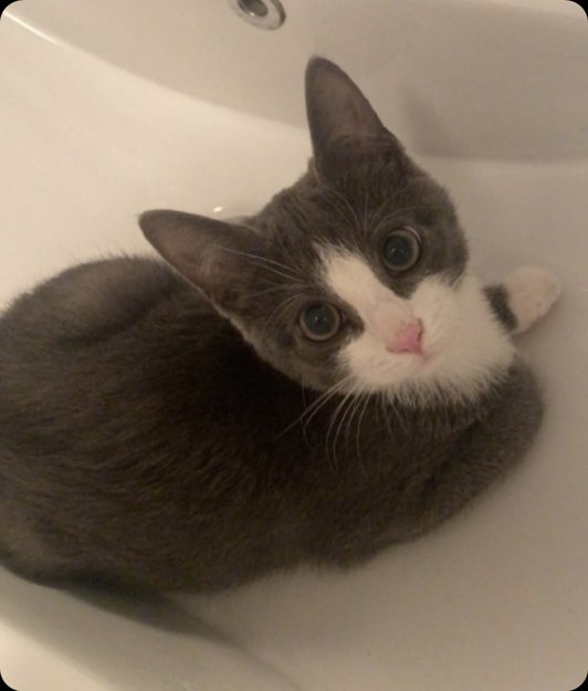 Grå med noe mørkere gråe striper på rygg og hale, hvit på mage, poter og litt av ansikt.
