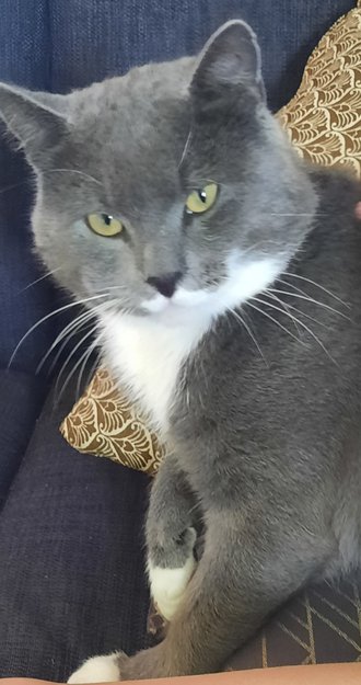 Grå katt med hvite poter,og hvitt på halsen. Veldig snill og kosete.