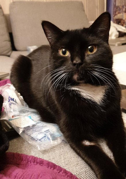 Veldig kosete og kontaktsøkende katt. Liten av vekst. Sort med hvite værhår, formet hvit flekk under haka som brer seg ned over brystet. Hvit spott på magen. Ankelsokker på potene.