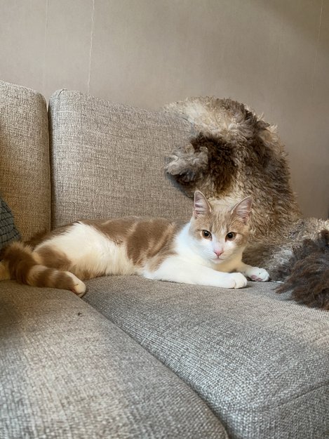 Han har oransje og hvit pels, med litt tiger mønster. Han er vant med å være inne og ute.