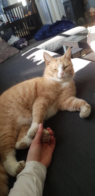 Han er en veldig rolig og bedagen katt. Han er lys orange i pelsen, med litt hvit.
