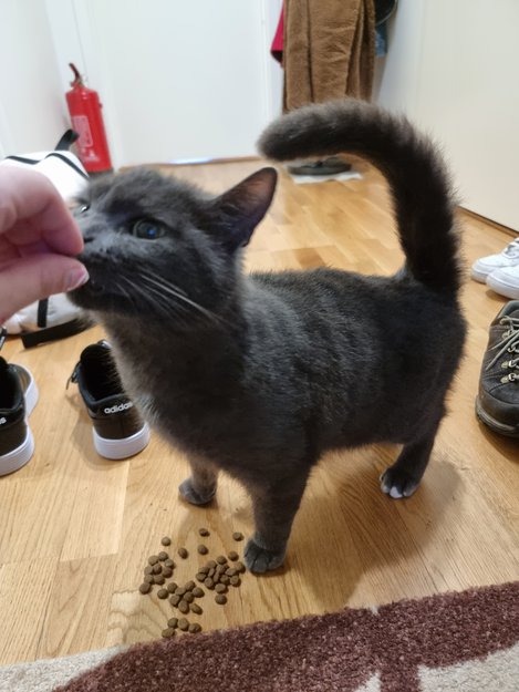 Grå hunkatt som virker veldig sulten, er også veldig pratsom. Har dukket opp på døra/terrassen. Virker veldig sulten.