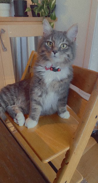 Usedvanlig flott hannkatt. En veldig tykk hale! Han ligner veldig på en Sibirsk katt. Han har et rødt halsbånd med sløyfe på. Det er et halsbånd som åpnes, hvis katten henger fast og det er godt mulig at dette har falt av han.