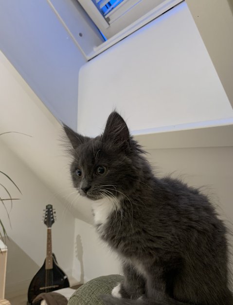 Grønn/brune øyne med lang pels med noen hvite flekker. Hun er liten og bare 6 måneder gammel.
