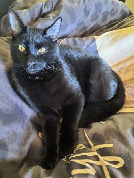 Svart,med et lite område hvitt på halsen. Han har på seg et gult refleks halsbånd. Han er kraftig,og har tykk fin pels,og veier rundt 5,3 kg. Han er nysgjerrig av seg,og lyder navnet sitt.