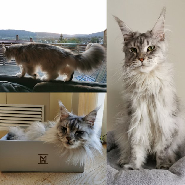 Hvit pels på mage/bryst, og mørkere på ryggen. Lang hale med lang pels. Mye pels på potene. Er ikke vant til å være ute alene, og er kanskje veldig redd.