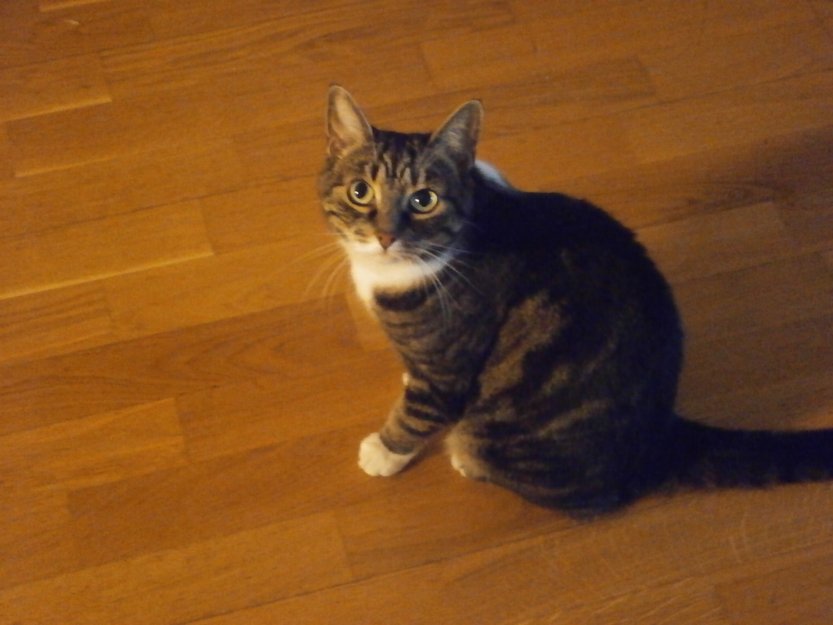 Hunkatt, ung voksen, tillitsfull og rolig. Leken. Hvite poter, hvit hals og en hvit stripe på det ene forbeinet. Den kan noen triks. Innekatt?