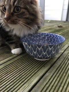 Katten er har hvit hage og hals, samt poter. Trippelfarget md mørk og lysbrun samt hvit.