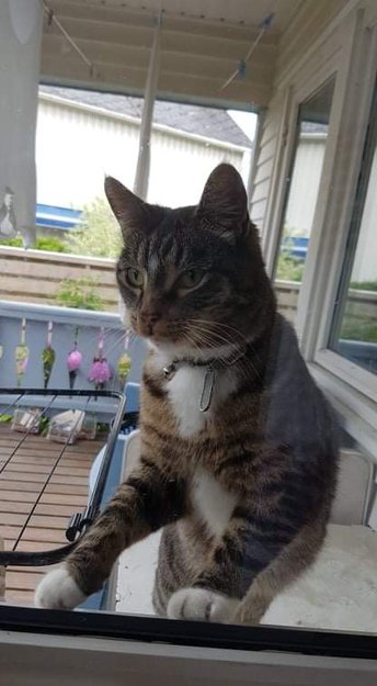 Han er brun med svarte tigerstriper. Han er hvit på halsen og litt på magen og hvit på potene. Han er kastrert og har et halsbånd med en rød bjelle.