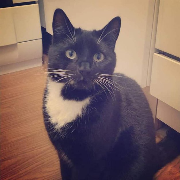 Delvis barbert på halen nær halerota etter dyrelegebesøk for et par måneder siden. Hadde enda halsbånd sist han ble sett, sølvfarget reflekshalsbånd med bjelle. Veldig folkeglad katt, skal være trygg å hente inn med mindre han er i store smerter. Pels er sort og litt hvit (hvit på poter og bryst, sort ellers).