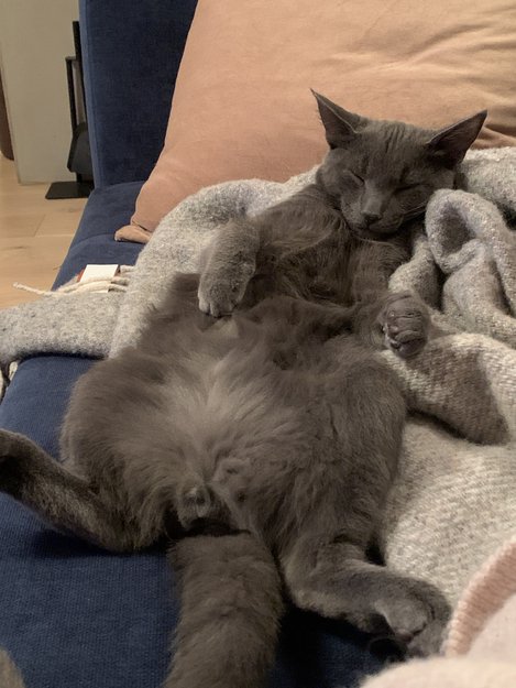 Storm er nesten 6 mnd gammel. Er helt grå og korthåret, med en liten hvit flekk på halsen. Den har kun vært innendørs til nå og har derfor ingen halsbånd. Den er chippet.