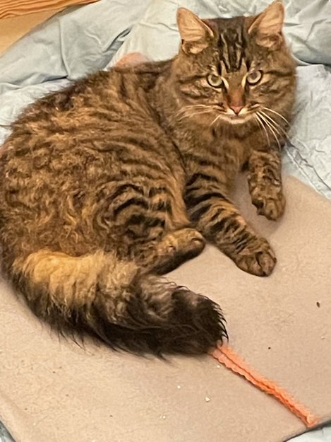 Katten har gått lenge i området, ble fanget i felle pga noen savnet en lignende, men det var ikke riktig katt. Denne var mager, og bunnløst sulten,men tam og kjærlig.