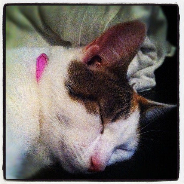 Hun er veldig kosete, slenger seg gjerne ned for å koses på magen og lyder navnet sitt Klara! Hun har på seg rosa halsbånd hvor telefonnummer står under knappen.