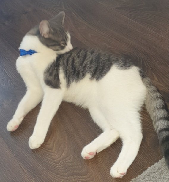 Han er hvit på underkropp, over kropp grå farget med mørke striper. Stripet grå hale, rosa poter. Han er hvit,med grå på ryggen og halen med striper. En hvit strek midt på ryggen. Har en liten rund mørk prikk på ene bak beina. Ene nedre øyelokk er rosa og den andre øye nedre øyelokk er mørk. Har grønn tatovering i øret.