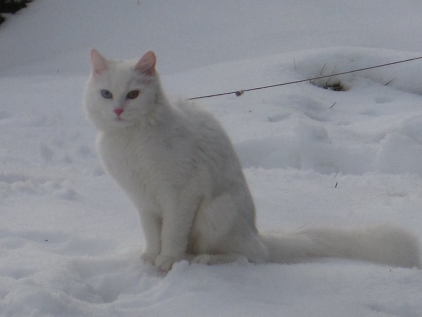 Helt hvit, odd-eyed (ett blått og ett brungult øye) og har en stor, bustete hale.