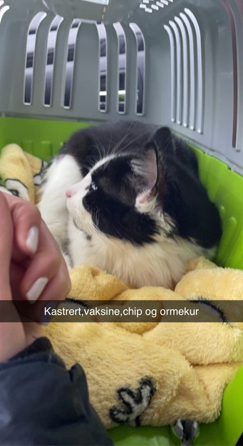 Han er sort med hvit i ansiktet og rundt halsen. Veldig kosen pus