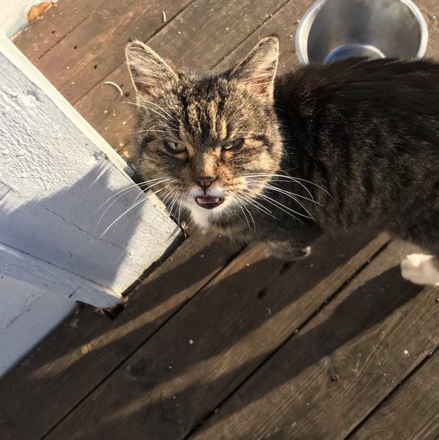 Hei! Det har dukket opp en liten katt hos en av naboene mine, som bærer preg av å ha gått ute en stund. Tynn og og den KAN ha en ryggskade om ikke det er tovete pels (jeg har ikke sett den selv)