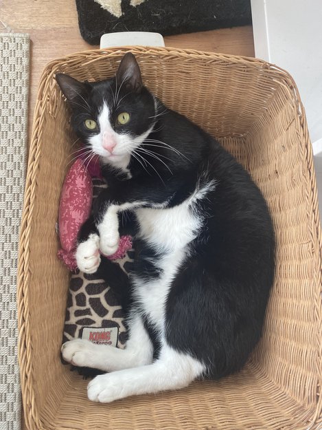 His name is blacky, he is black and white , with a special shape white dot on the mouth and nose, clear green eyes. 1 year old. He is not castrated and has not chip.