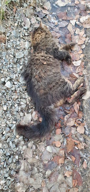Påkjørt katt funnet. Hankatt, ukastrert. Ingen chip funnet. Levert vetrinær høyskolen i ås