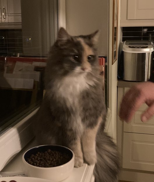 Sent på kveld fant vi en katt på trappa, inne i bolig (rekkehus). Katten skjelver (er redd? fryser?) Siden det er kuldegrader ute, har katten vært inne hos oss.