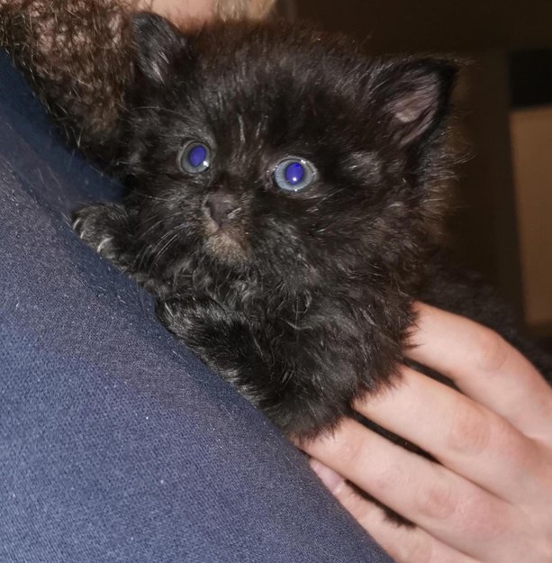 Svart fluffy pels, veldig liten, ca 5 uker gammel.