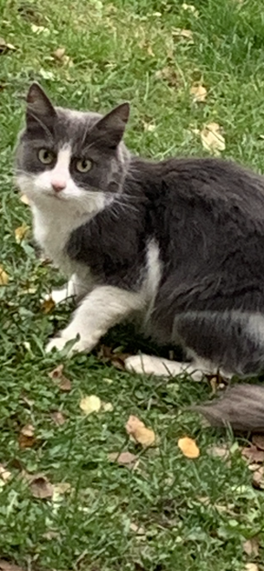 Grå katt med hvite poter og hals/bryst. Voksen men liten av størrelse.